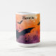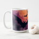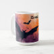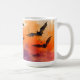 Big, spooky bats fly across a sunset-coloured background on this creepy, haunted Halloween mug.