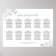 This seating chart will help your guests find their assigned tables at your wedding reception. The design is simple yet elegant with dark grey and light blue text on a white background. The title is written in beautiful script calligraphy lettering and reads: please find your table. Chic, pretty and sophisticated with lacy floral faux foil silver filigree in the corners. Contains seating assignments for 10 tables at 10 guests per table or 100 guests.