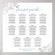 This 11 table seating chart is both simple and elegant with dark grey and light blue text on a white background. The design features a lacy script calligraphy title with decorative frilly faux foil silver filigree in the corners. Stylish, chic and sophisticated way to help your guests find their seats at your wedding reception. It includes table assignments for 110 guests with 10 seats per table.