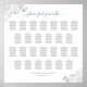 This beautiful wedding seating chart features dark gray and light blue text on a white background with seating assignments for 260 guests - 26 tables at 10 seats per table. It features a simple yet stylish and elegant design with ornate decorative faux foil silver filigree in the corners. The title is written in fancy script calligraphy and reads: Please find your table.