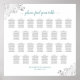 This beautiful wedding seating chart features dark gray and teal or turquoise text on a white background with seating assignments for 260 guests - 26 tables at 10 seats per table. It features a simple yet stylish and elegant design with ornate decorative faux foil silver filigree in the corners. The title is written in fancy script calligraphy and reads: Please find your table.