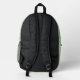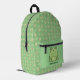 Adorable backpack featuring a cute pattern of lots of green frogs and green leaves on a green background. On the front pocket is a single larger green frog on a plain green background with a template to add your name or other text to personalise.