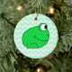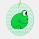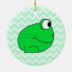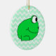 A cute green frog cartoon. This funny looking frog is on a light green zigzag pattern background.