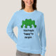 Imagine a light blue, long-sleeved tee-shirt with a vibrant green frog design on the front. The frog is a rich, leafy green, with dark spots on its back for texture. Its large, expressive eyes give it a friendly, cartoonish look, making it seem playful. The frog is sitting, with its legs slightly spread, as if ready to leap. The design pops against the soft blue background of the tee, creating a whimsical, fun vibe, perfect for casual wear.