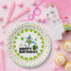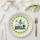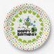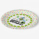 Frog Hoppy 3rd Birthday party paper plates features a big eyed green frog with a blue party blower and blue party hat, lots of little stars, text that reads It's My 3rd Hoppy Birthday, and lots of polka dots of blue, green, orange, yellow, and red on white! What three year old wouldn't love these cute frog theme birthday party paper plates? We have the matching T-shirts, bodysuits, bibs, and other items as well!