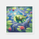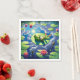 A vivid green frog is comfortably sprawled on a lily pad, soaking in the sun's rays amidst a tranquil pond dotted with pink blooming lotus flowers