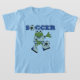 A green frog in a blue and white soccer uniform and a soccer ball on Frog Soccer Tshirts, mugs, cards, stickers, keychains, mousepads, and other soccer clothing and gifts.