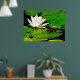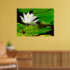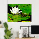 A frog sits handsomely within the reflection of the nearby Water Lily. To the left of the lily pad you can see a small tadpole swimming in the pooled water.