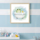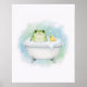 Add cheerful charm with this cute frog-in-a-bathtub kids bathroom wall art featuring rubber ducks and blue-green watercolor bubbles.