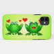 Cartoon green frogs, boy and girl frog with red hearts, cute, funny and expressive, gradient green / yellow background.