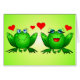 Cartoon frogs in love, male and female frog, cute, funny and expressive, red hearts, gradient green / yellow background, blank interior. Hoppy blessings from Happy Wishing Well dot com.