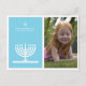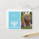 Beautiful and modern Hanukkah postcard for the design savvy. Blue background with a sweet and stylish menorah and a Star of David on the top. Personalise it with your own message, family picture and name. Stylish, clean and fresh.