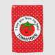 Cute round bright red tomato with five green leaves for hair ans a happy smiling face. Above and below the tomato is a funny pun in black text reading "I love you from my head tomatoes". The background is red with a retro pattern of yellow polka dots.