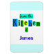 A custom retro "From the Kitchen of" with script and cute kitschy letters in black against colour blocks of blue, green and teal, with light teal top & bottom borders.