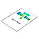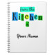 A custom notebook with retro letters reading "From the Kitchen of" with scripty and cute black letters against colour blocks of blue, green and teal. Customise it to change fonts, background colours and more and save your design for later.