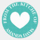 From the kitchen of stickers with turquoise blue polka dots pattern. Personalised party favour name tags with custom message. Elegant round polkadots design with love heart symbol and stylish typography. Add your own name and / or family surname. Cute round DIY labels or seals for home made cooking and baking products like cookies, sweets, cake, cupcakes, Christmas Holiday treats etc.