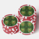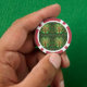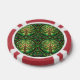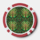 Front and back view of a poker chip with red edges and intricate green tree design at the center, conveying a sense of nature and symmetry.