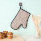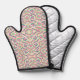 Front and back view of an oven mitt. The front features a colorful, intricate geometric pattern, while the back is quilted silver. The mitt has a black trim and loop.