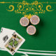 Front and back views of a poker chip with a colorful floral pattern featuring orange, purple, and black flowers. The chip has orange and white segments.