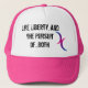 Hot pink and white trucker hat with Bisexual moon symbol and text: Life, Liberty and the pursuit of... both, supports bisexuals