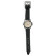 Front view of a wristwatch featuring a colorful floral-patterned face, black bezel, and black rubber strap. Back view shows the stainless steel case and clasp.