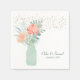 A whimsical blue green frosted image mason jar holds pastel orange and coral flowers with soft teal greenery on the front of this pretty wedding paper napkin. A background of gold confetti flecks adds interest and contrast to the delicate flowers. Your custom text is in darker teal. Be sure to see the matching wedding invitations and other wedding products in our store. *This design uses artwork from LABFcreations on Etsy.