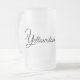 This tall frosted glass mug is shown with a art print of a elk with Yellowstone text.