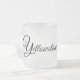 This frosted glass mug is shown with a art print of a wolf with Yellowstone text.