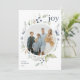 This elegant and classic holiday photo card features a beautiful circular watercolor frame of leaves, berries, and other greenery over a simple white background. The greeting on the front says "Joy" in a classic serif font. The back of the card has a simple sage green and white diagonal stripe background, which can be removed if desired. You can also add another photo to the back and/or additional text to the back.