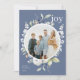 This elegant and classic holiday photo card features a beautiful circular watercolor frame of leaves, berries, and other greenery over a dark smokey blue background. The greeting on the front says "Joy" in a classic serif font. The back of the card has a simple dusty blue and white diagonal stripe background, which can be removed if desired. You can also add another photo to the back and/or additional text to the back.