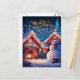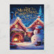 Festive Christmas card featuring a jolly snowman standing in front of a cosy house in a snowy landscape.