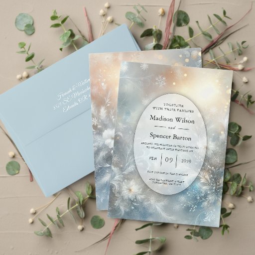 Step into a dreamy winter wonderland with this elegant wedding invitation, featuring soft frosted petals swirling amidst golden light and delicate snowflakes. The ethereal design blends icy blue and silver tones with warm golden accents, creating a romantic balance of winter magic and timeless sophistication. Perfect for winter and holiday weddings.
