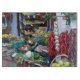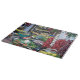 A colorful photograph of a fruit and veg shop printed on a glass chopping board.