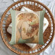 A decorative pillow with the illustration by Alphonse Mucha (1860-1939), Fruit (1897). A portrait of a woman holding a basket of fruit with pears, grapes and apples.
