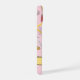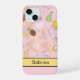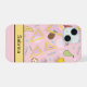 Personalise this iPhone case printed with a colourful abstract fruit and memphis style pattern on pink and yellow. Just edit the name text. Choose from two styles for Apple iPhone 15 or a variety of other phone models in the drop-down menu.