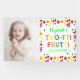 Two-tti Frutti! Summer fruit 2nd birthday featuring watermelon, blueberries, strawberries, oranges, peaches, bananas, and cherries. Photo template via Pixabay licensed under CC0 and must be replaced with your own photo