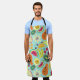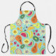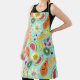 This item is an apron with a light green background. It has black straps and the apron has a design with fruits and vegetables.