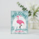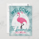 Ft Lauderdale Florida pink flamingo. In vintage travel posters style, it says "Welcome To Ft Lauderdale, Florida" in pink, white and mint green turquoise.