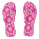 Flip Flops in a tie dye pattern in shades of deep fuchsia pink, orchid, and pastel pink, accented with soft violet
