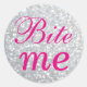 This super cute "bite me" sticker, makes a great accessory for any appetizer, dessert or food favour. The background of this sticker is a photo illustration and no real glitter is used.
