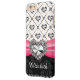 A glitzy hot pink and black printed faux rhinestone heart and diamond design with a fuchsia satin bow look and repeating solitaire diamond and heart patterned design. Your name can be added to the subtle grey and black damask pattern background. Artwork and design © Chrissy H. Studios, LLC. All Rights Reserved.