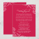 Make a vibrant and unforgettable statement with this fuchsia wedding rehearsal dinner invitation. White scrollwork flourishes and sweeping calligraphy headline a charming rhyming poem that details your ceremony practice and celebratory dinner. The bold fuchsia background radiates energy and excitement for the big weekend ahead. Customise all text, colours, and layout to perfectly match your celebration.