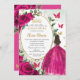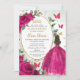 Personalise this elegant fuchsia hot pink floral Quinceañera / Sweet 16 birthday invitation easily and quickly. Simply click the customise it further button to edit the texts, change fonts and fonts colours. Featuring a girl dressed in a beautiful glittery fuchsia ball gown, vibrant fuchsia roses, butterflies and a gold trimmed oval space to put all your important celebration details. Matching items available in store. (c) Somerset Fine Paperie