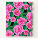 Journal in a pattern of camellia flowers in shades of deep to pastel fuchsia pink, against a background of dark jade green leaves