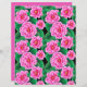 Paper in a pattern of camellia flowers in shades of deep to pastel fuchsia pink, against a background of dark jade green leaves