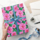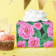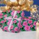 Wrapping paper in a pattern of camellia flowers in shades of deep to pastel fuchsia pink, against a background of dark jade green leaves