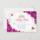 Fuchsia pink gold and white floral Quinceanera RSVP reply card. Features, script font, gold butterflies, watercolor roses and tiara. Perfect for an elegant princess style glam celebration. Personalize with your own details.