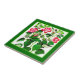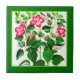 Ceramic tile in a vintage Mediaeval drawing of deep fuchsia pink Italian Hibiscus flowers, with an emerald green border