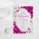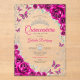 Fuchsia pink silver and white Quinceanera celebration invitation. Features script font, silver butterflies, watercolor roses and tiara. Perfect for an elegant princess style glam celebration. Personalize with your own details. Stylish transparent or frosted acrylic invitations.