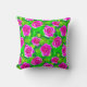Throw pillow in a pattern of deep fuchsia pink, watercolor, roses with leaves in shades of emerald green